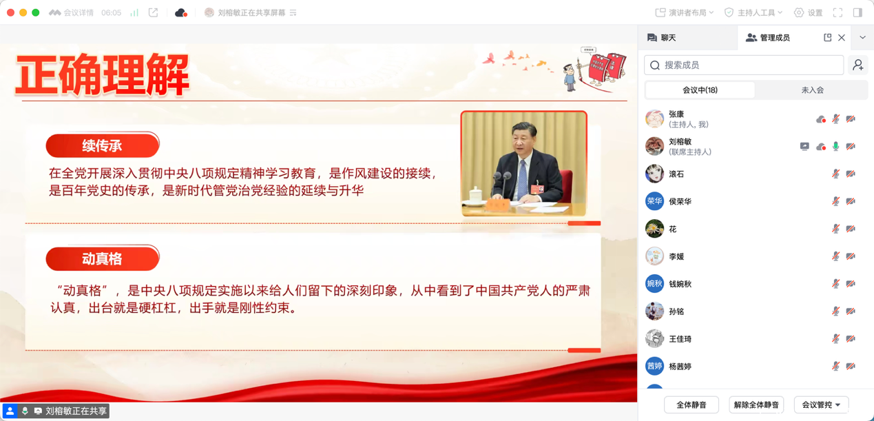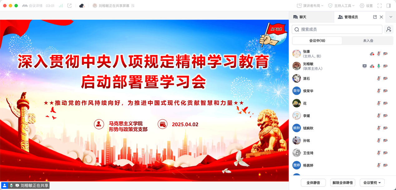 2025年4月2日,形势与政策党支部召开深入贯彻中央八项规定精神学习教育启动部署暨学习会,会议以线上会议形式开展,主要是深入学习中央八项规定精神,部署贯彻落实工作。会议由教研室主任张康和支部书记刘榕敏副教授主持,围绕“学深悟透、知行合一”目标,推动作风建设与教学实践深度融合。